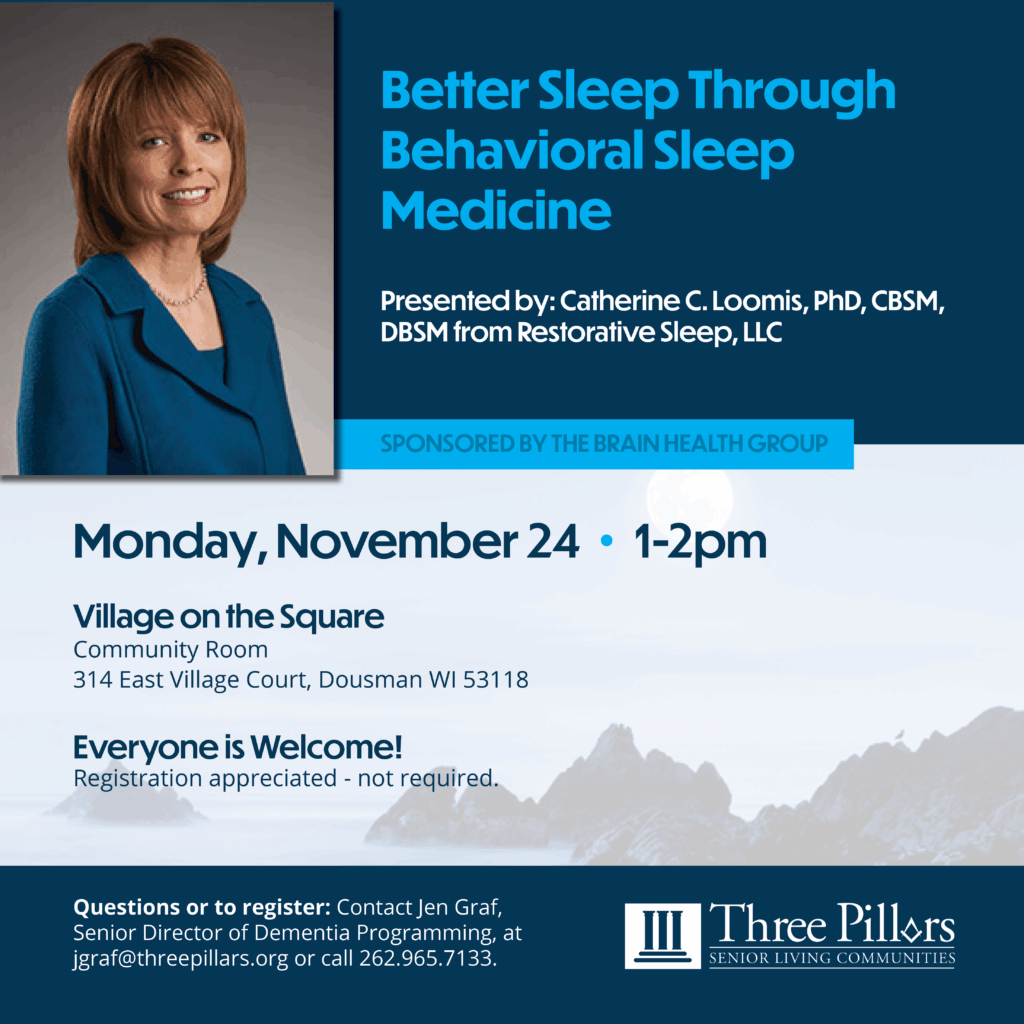 Better Sleep Through Behavioral Sleep Medicine Presented by: Catherine C. Loomis, PhD, CBSM, DBSM from Restorative Sleep, LLC Sponsored by Three Pillars Brain Health Group. Behavioral Sleep Medicine (BSM)…